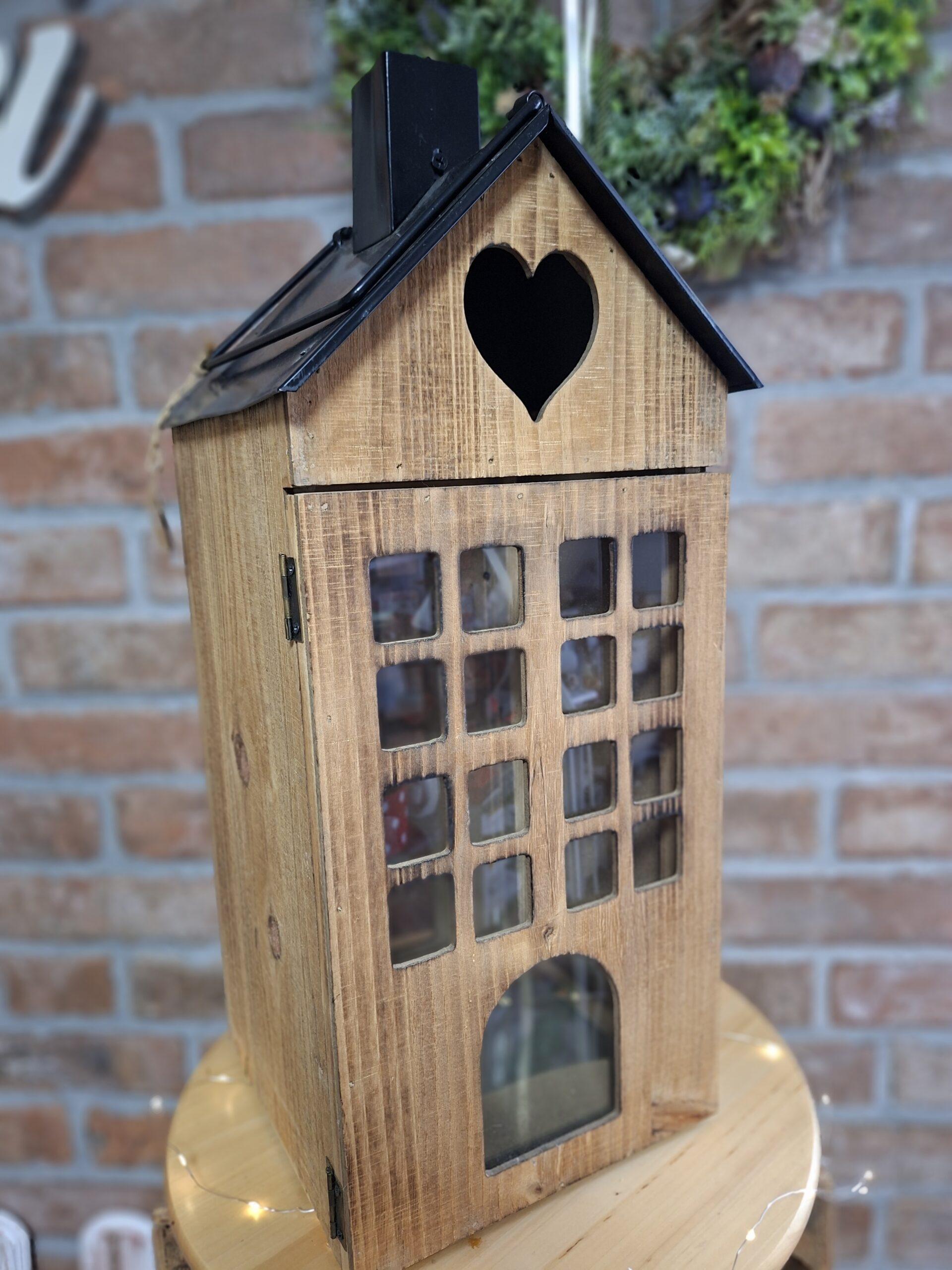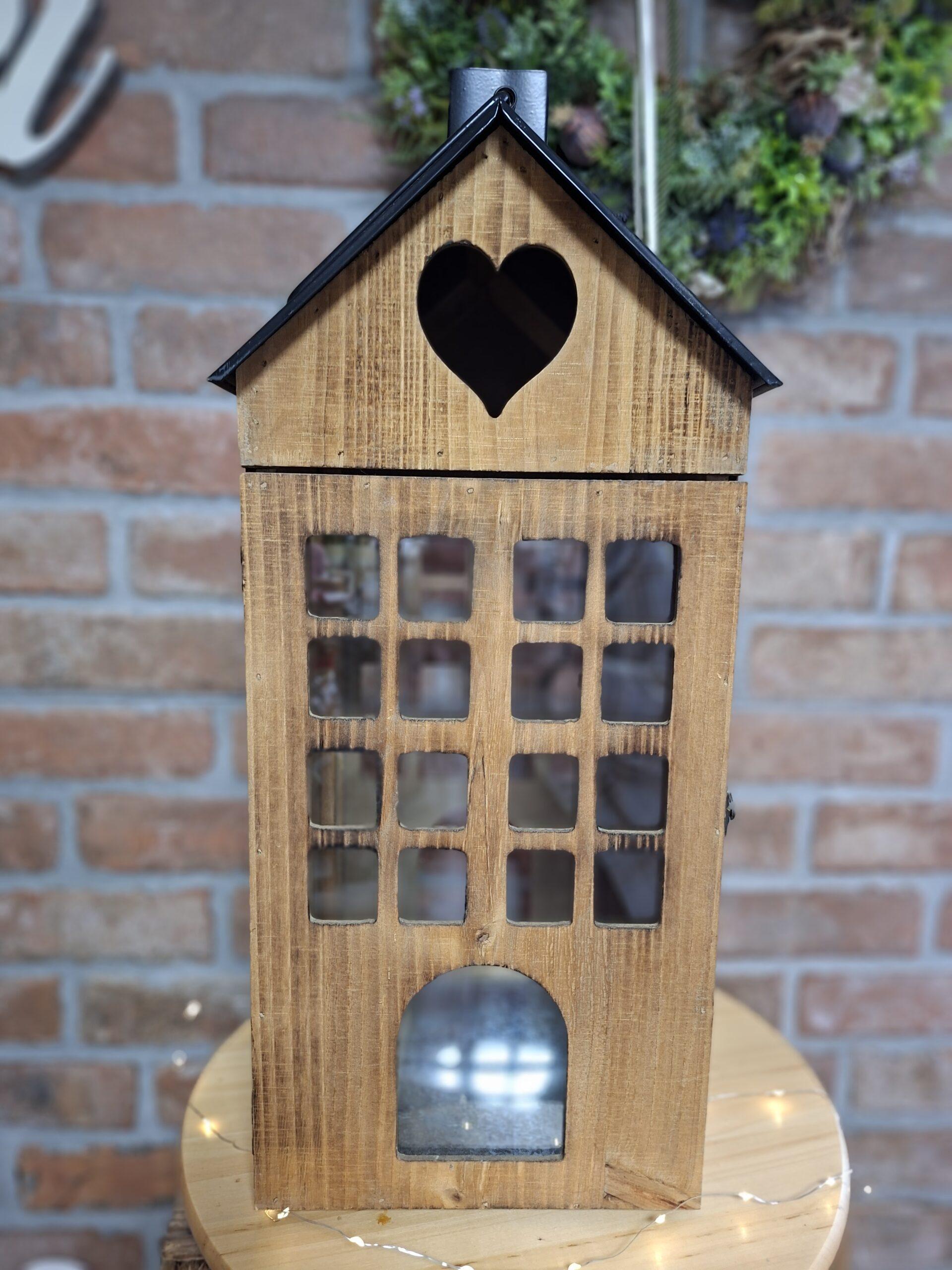 Štýlová drevená lucerna v tvare domčeka vytvorí vo vašom domove príjemnú a útulnú atmosféru. Kombinácia dreva, skla a kovu pôsobí elegantne a zároveň rustikálne. Vhodná na sviečku alebo LED sviečku, ideálna do interiéru aj na krytú terasu.