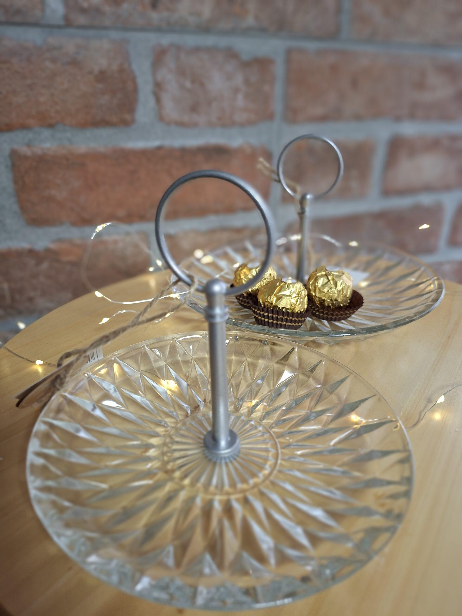 Elegantná sada dvoch sklenených podnosov s kovovým úchytom je ideálna na servírovanie orieškov, sušienok či drobného pečiva. Praktické a zároveň štýlové riešenie na každodenné aj slávnostné stolovanie.