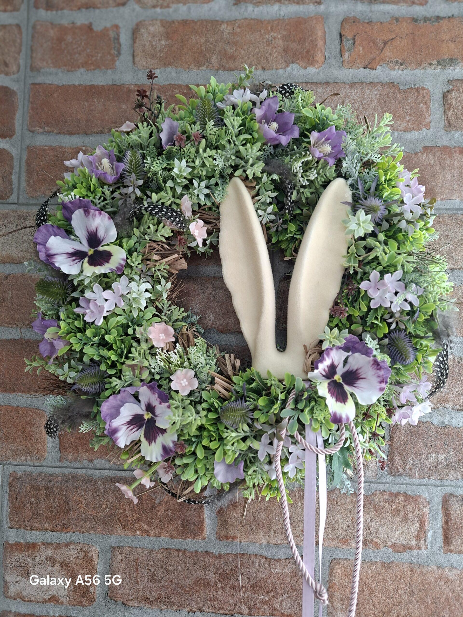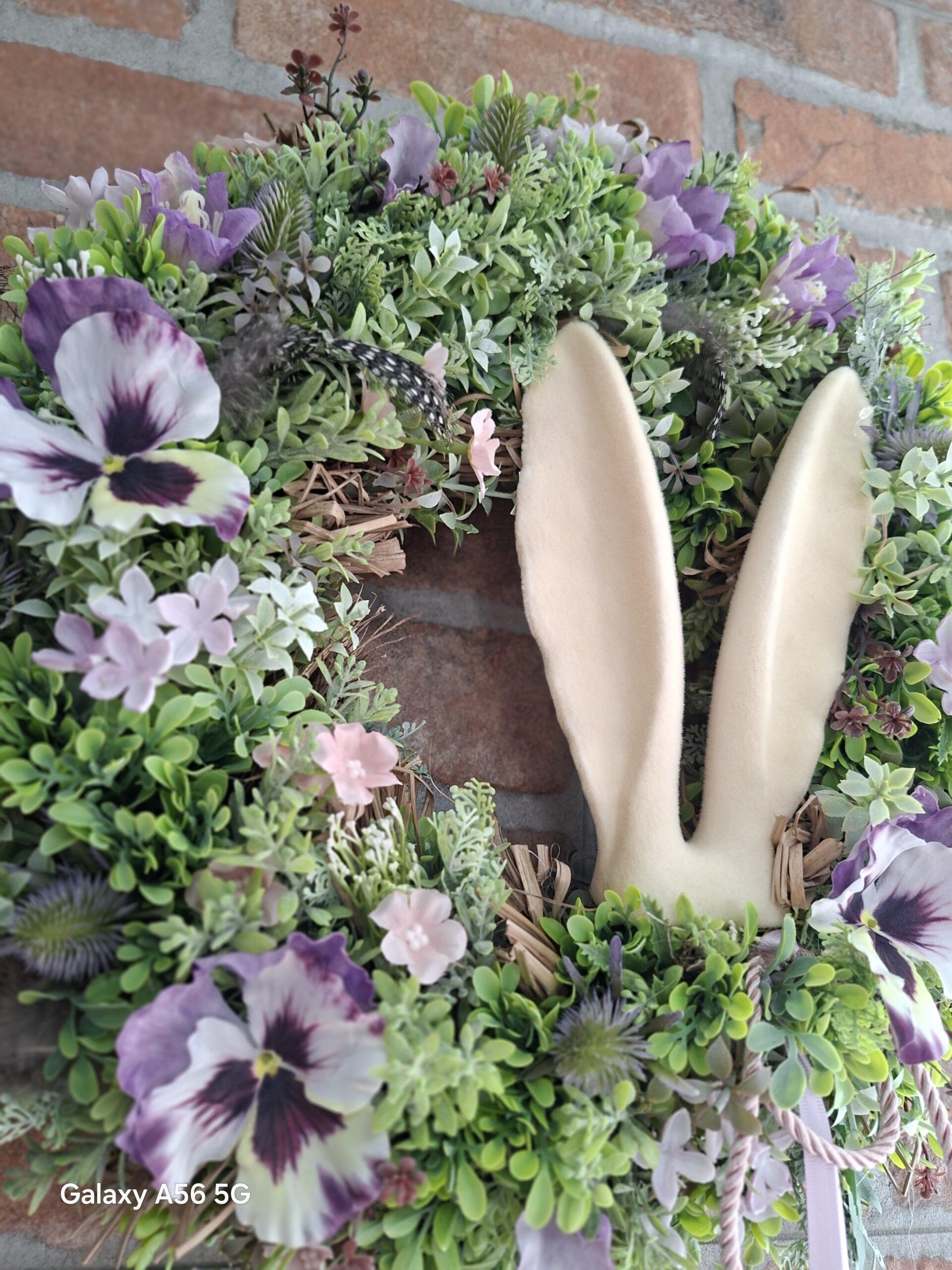 Veniec s priemerom 43 cm je ručne viazaný s dôrazom na detail a prirodzenú harmóniu farieb. Kombinácia prírodných prvkov a jemných jarných tónov pôsobí sviežo, hravo a zároveň elegantne, takže sa hodí na dvere, bránku aj do interiéru na stenu.