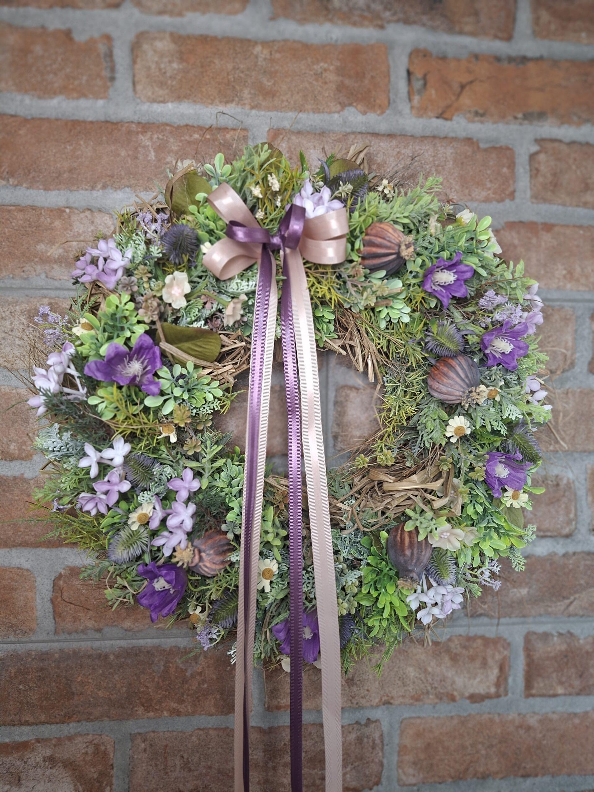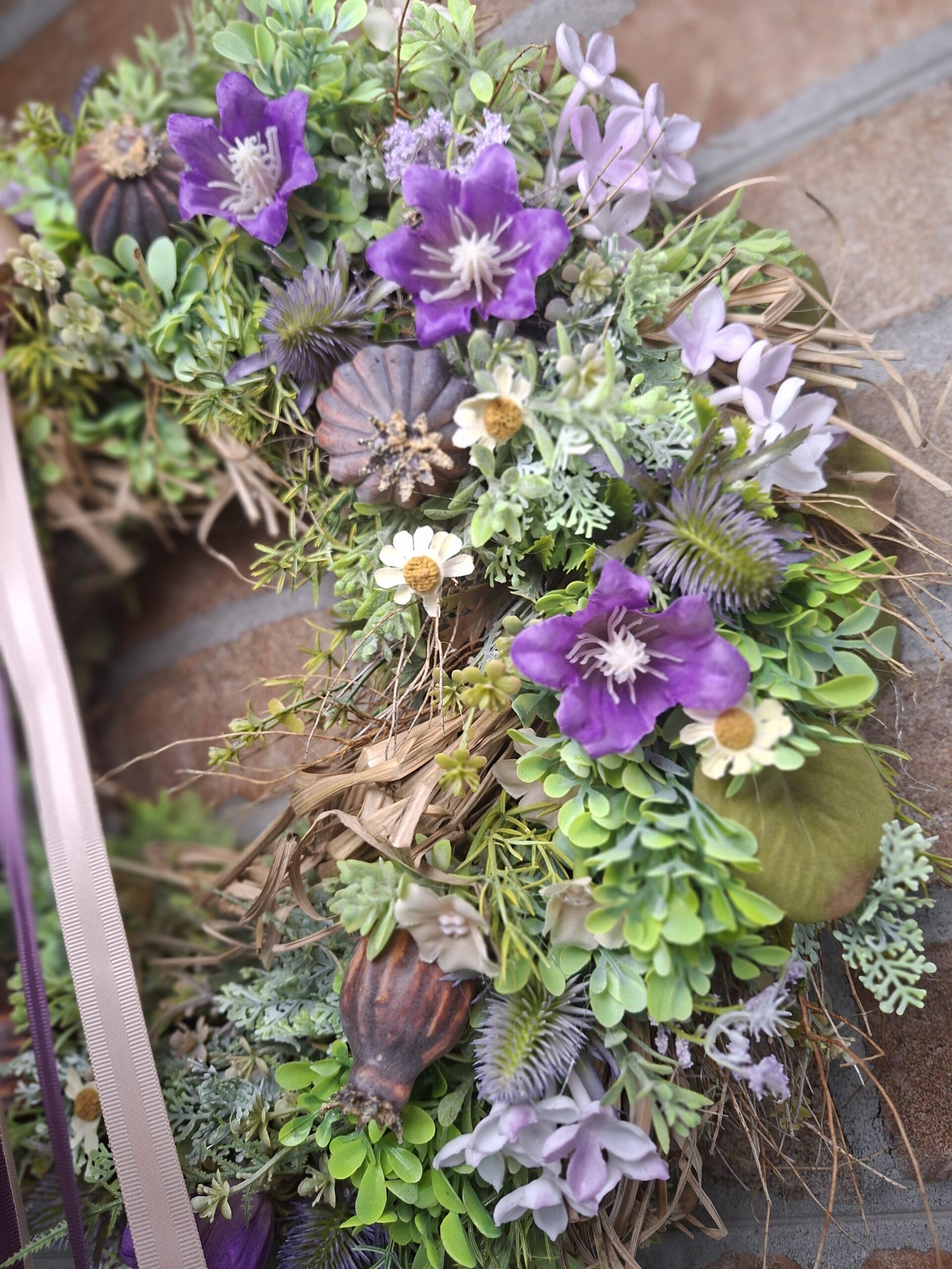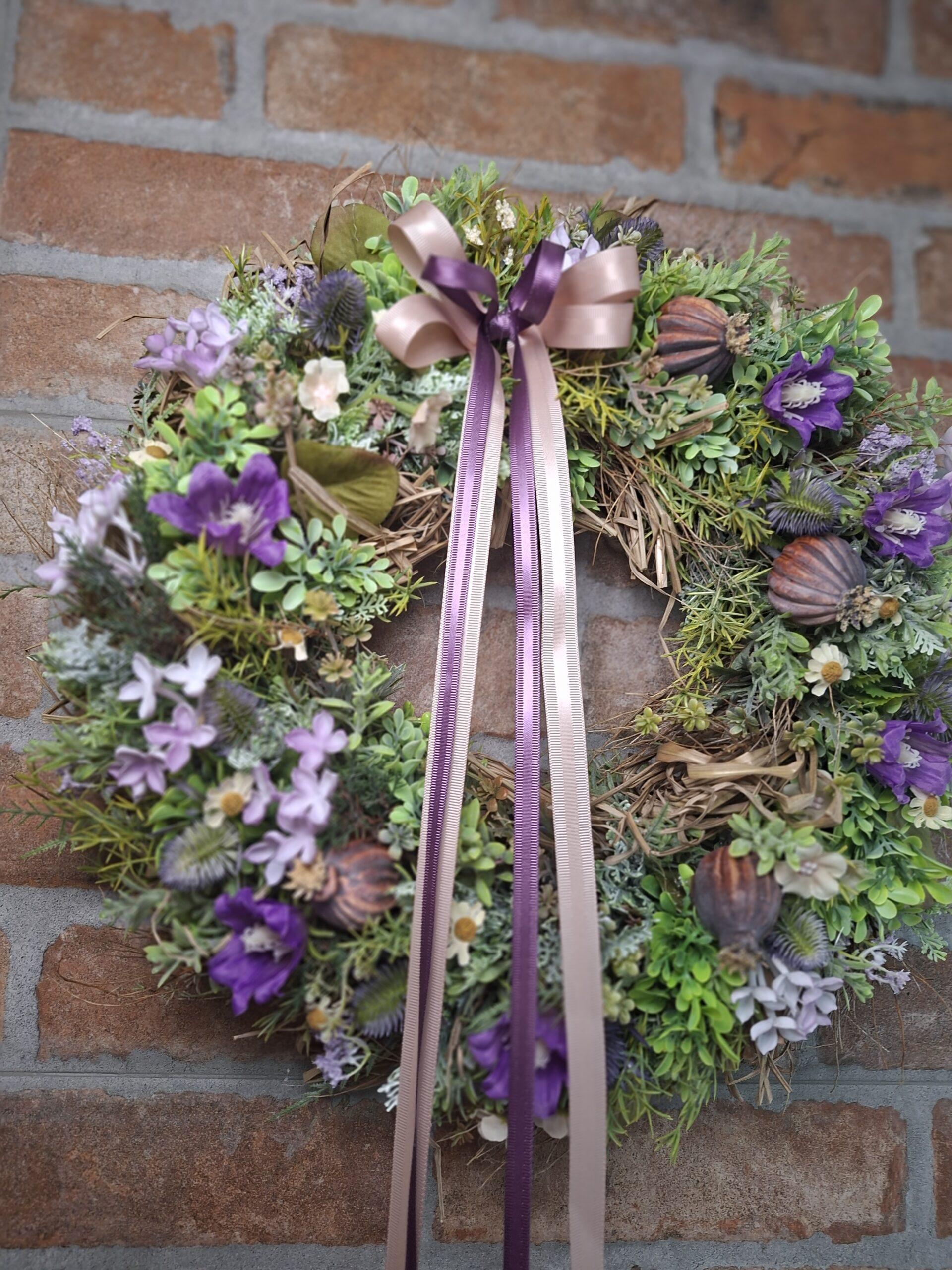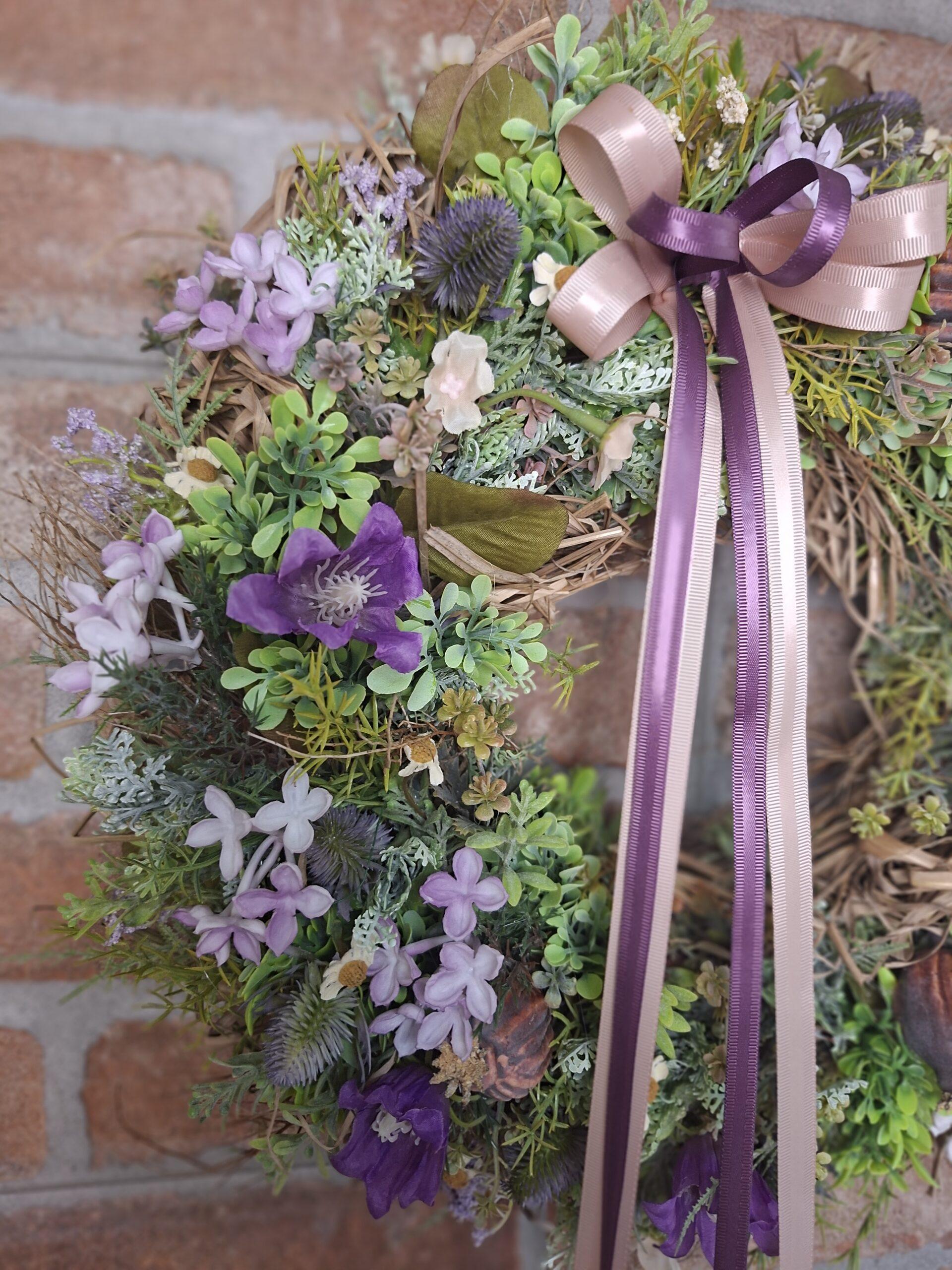 Dekoračný veniec je ručne viazaný na slamenom základe. Zdobí ho mix kvalitnej umelej zelene a realistických hodvábnych kvetov, ktoré pôsobia prirodzene a sviežo.