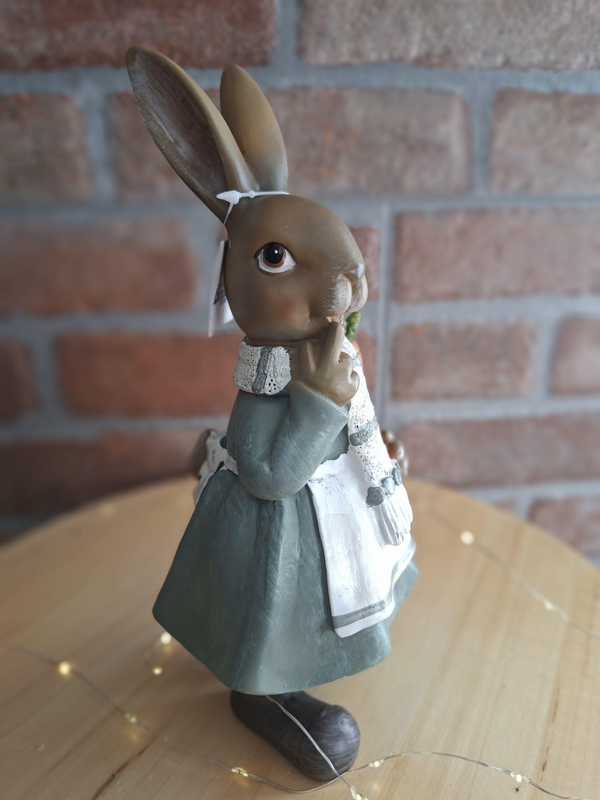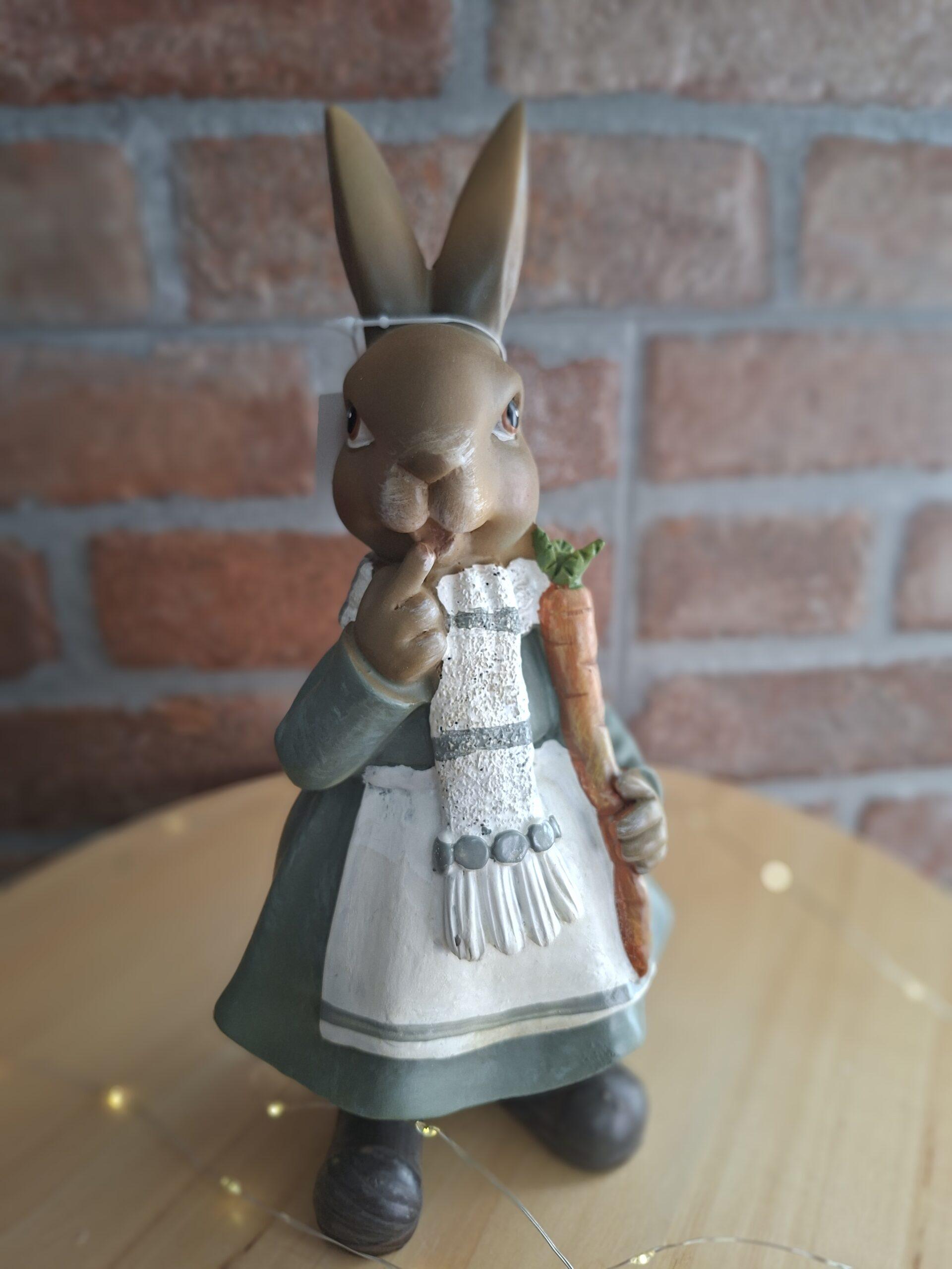 Keramická zajačica s mrkvou s výškou 23,50 cm. Vhodná ako do prírodných aj umelých aranžmánov, vencov, či jarných dekorácií.