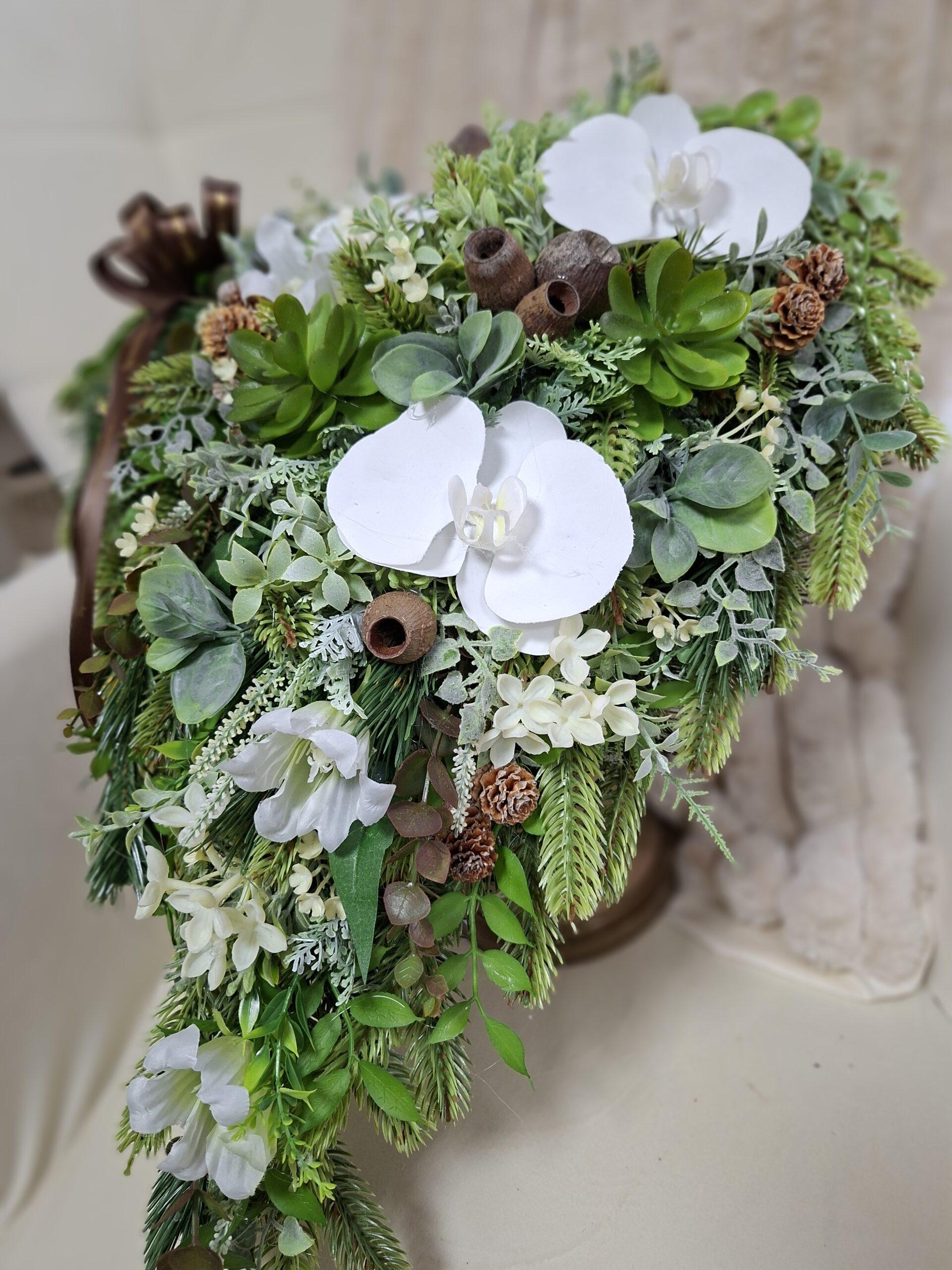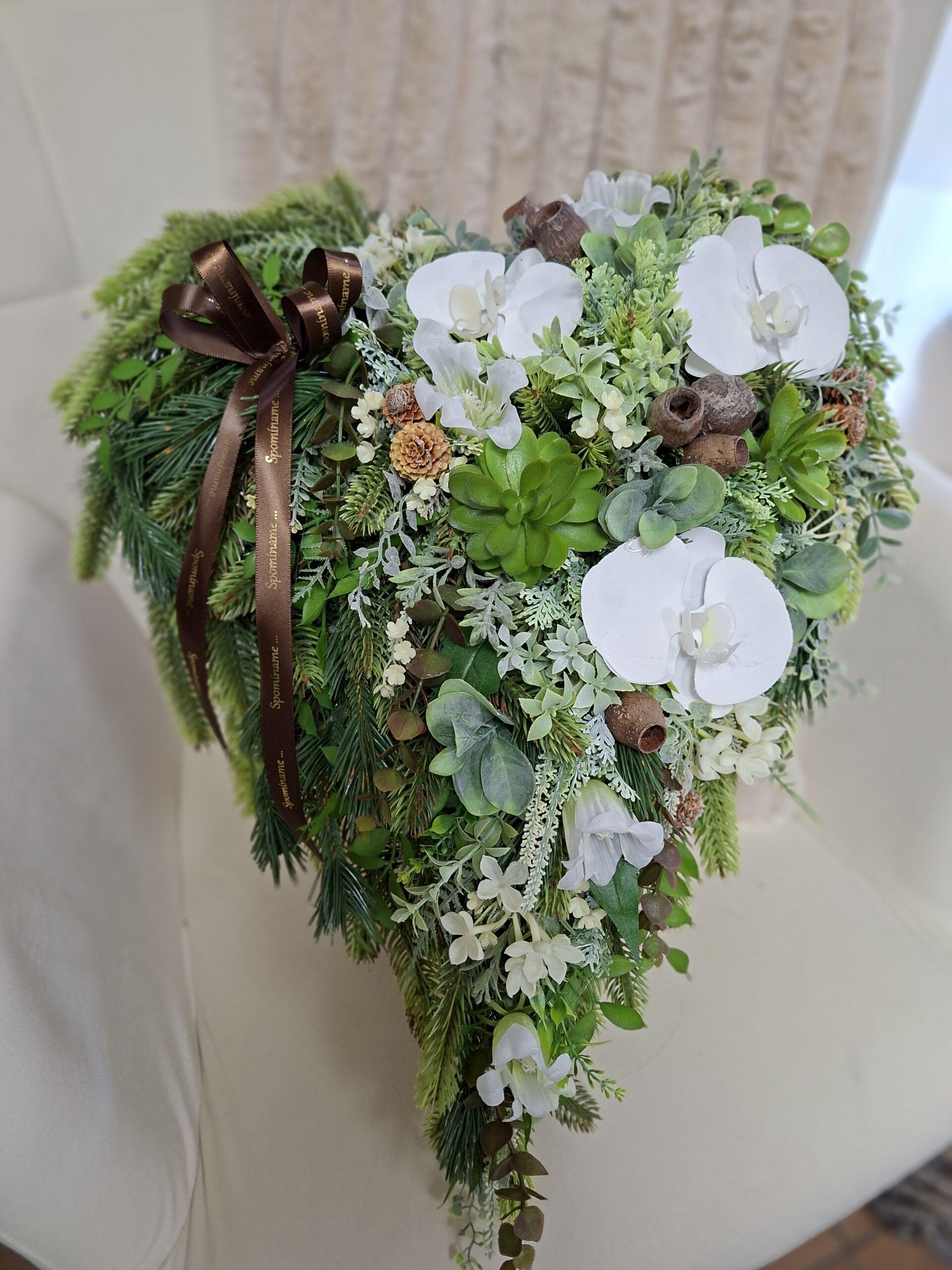Vkusné zatažené srdce vytvorené z realistickej 3D čečiny predstavuje jemnú a dôstojnú spomienku na našich blízkych. Precízne aranžovanie dopĺňajú kvalitné dekoratívne kvety, ktoré dodávajú celku eleganciu a prirodzený vzhľad.