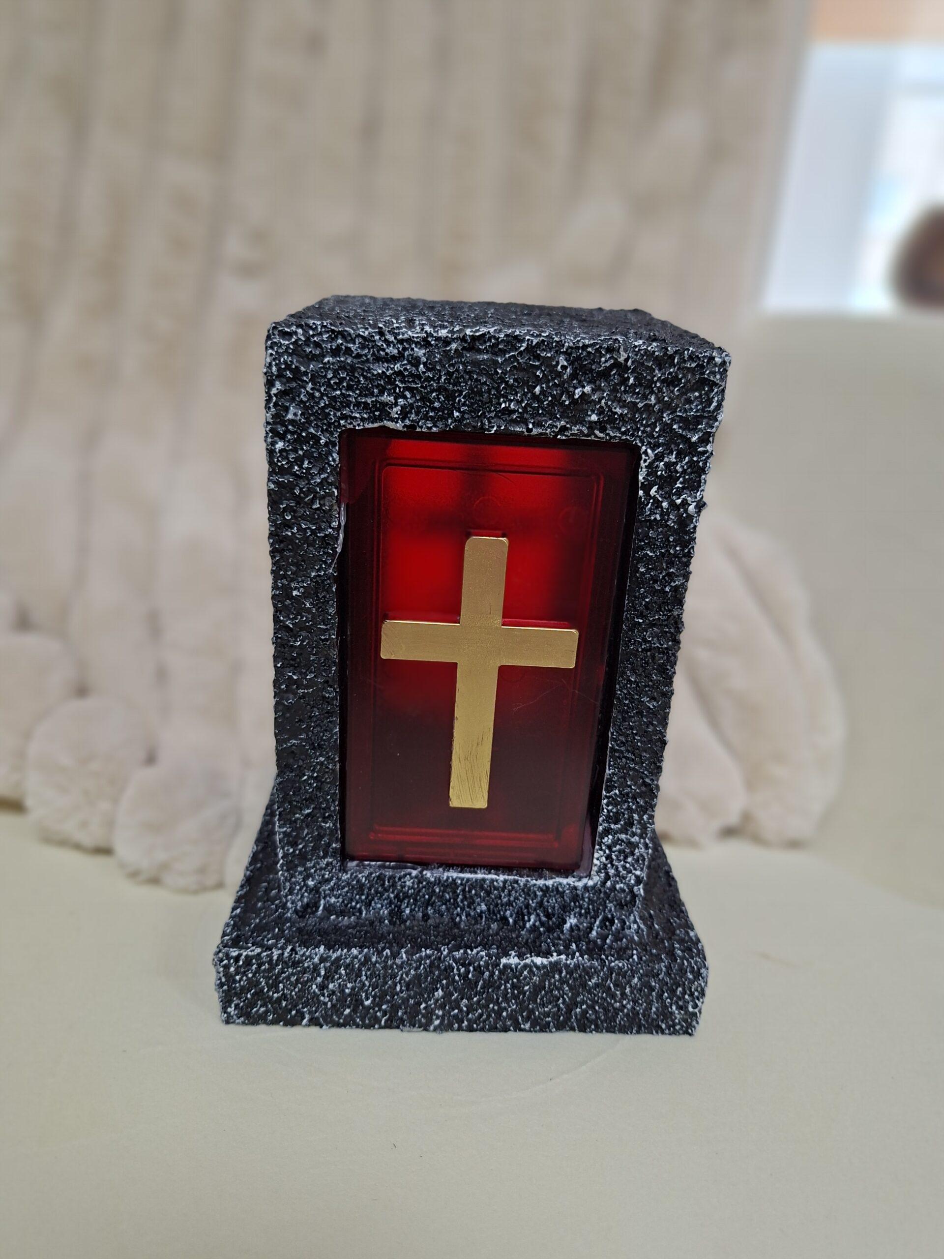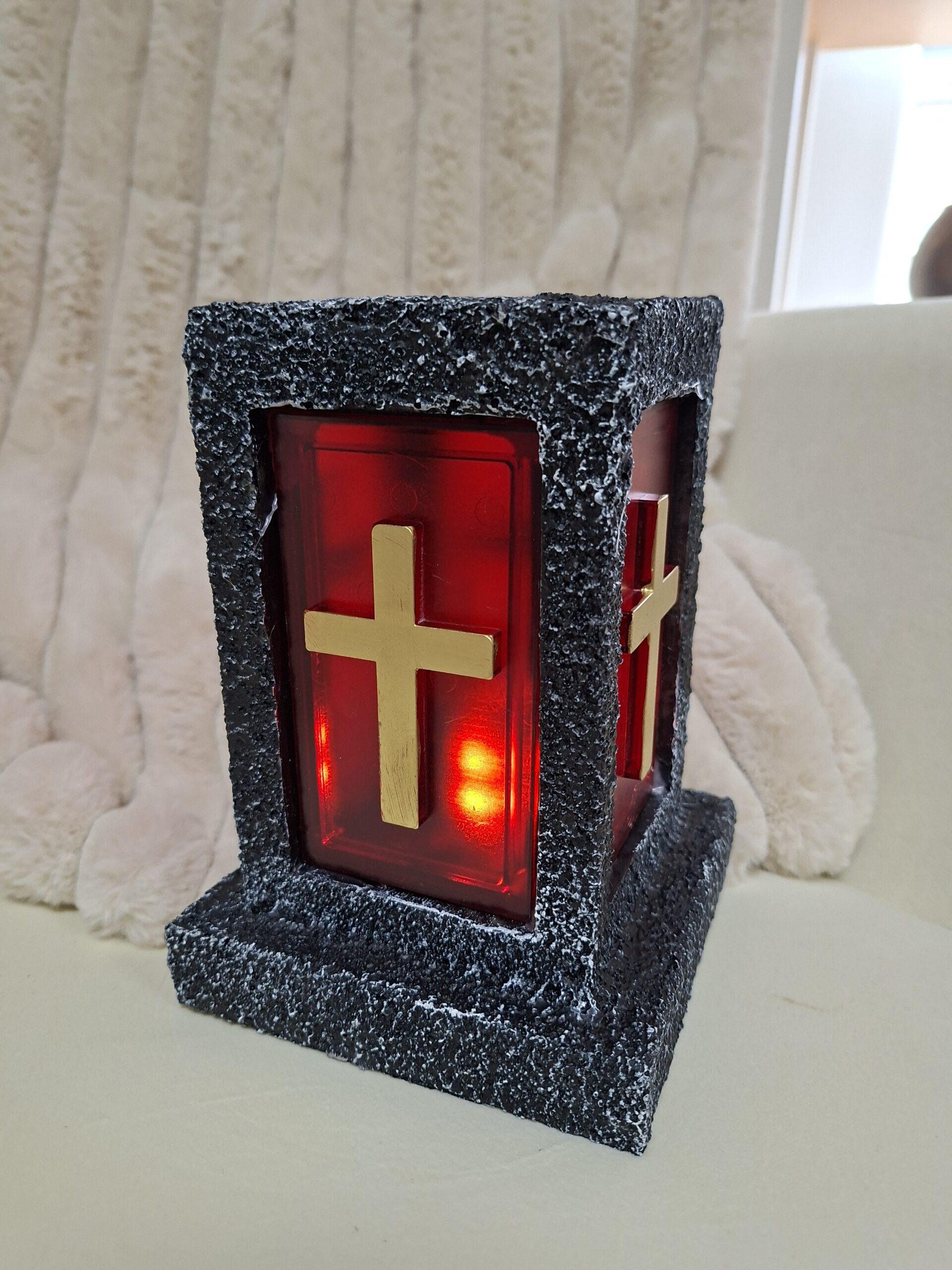 LED kahanec – živý plameň, kamenná lucerna s krížom